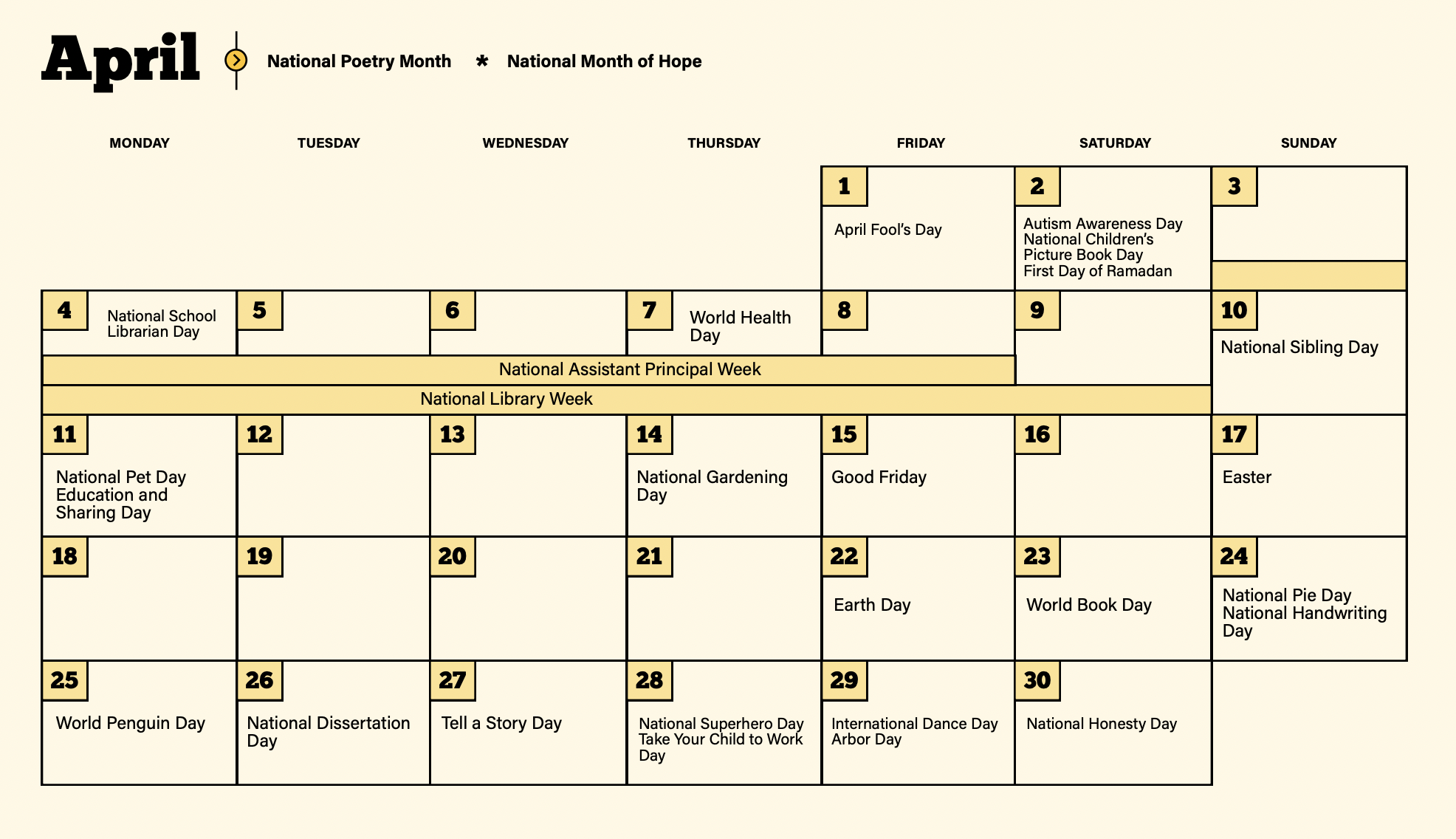 Spring has sprung. 🌱 This is a great time of year to talk about all things nature and environmentalism, science, and new beginnings. There’s also a helpful “spring cleaning” angle you can insert into your content and social posts. There’s an opportunity to show appreciation for Assistant Principals during National Assistant Principal Week (April 4-8) and librarians and library media specialists during National Library Week (April 3-9).