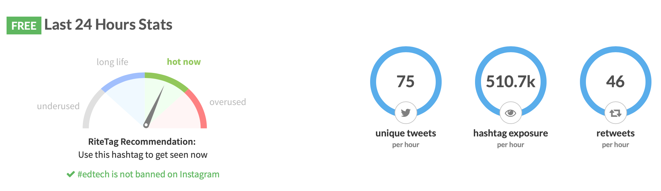 We’ve used RiteTag for quite a while because it’s easy to use and free. While it’s not perfect, you can easily search for your hashtag and learn how many impressions it gets per hour. Ritetag offers other paid products that enhance your social posts, create calls-to-action on links, and schedules and publishes posts. We tend to just use the top search bar and search for specific hashtags. Here’s an example of a search using #edtech.
