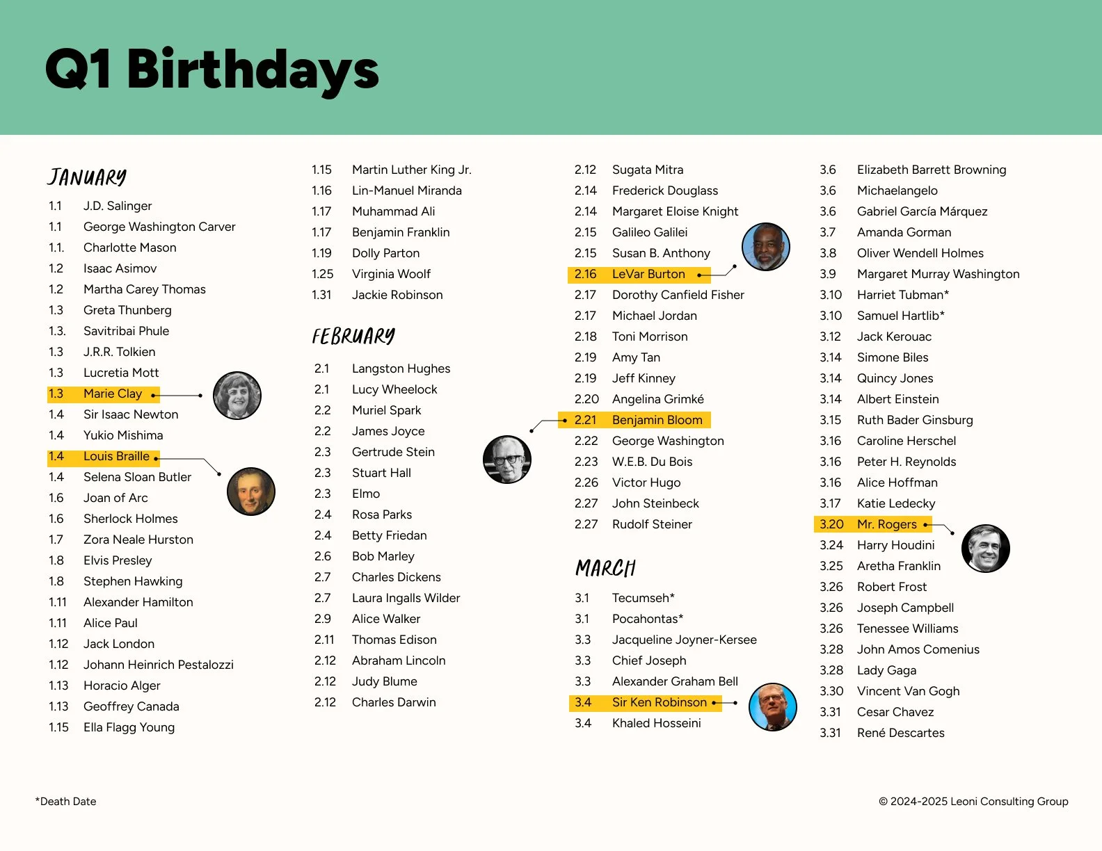 Ready to incorporate birthdays into your content strategy? Check out the list and image below for some of the most impactful figures to celebrate this quarter.