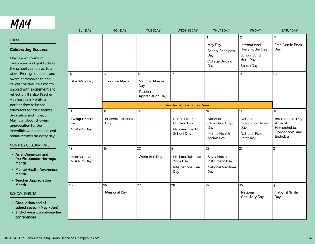Teacher Appreciation Week (May 5-9): Engage educators with appreciation campaigns, giveaways, and recognition efforts. Teacher Appreciation Day is May 6.