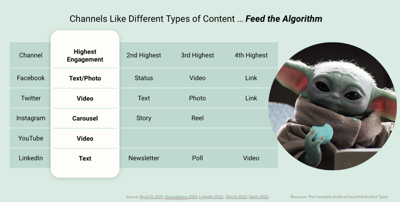 For starters, it’s important that you are using post types that work for each social media platform. To do this, it’s important to feed the algorithm with the post types each platform prioritizes.