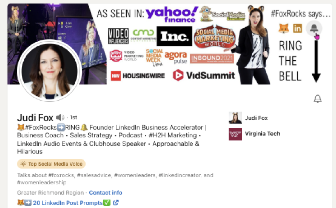 It's crucial to be clear and actionable on LinkedIn so that visitors know exactly what you want them to do. You can do this through strategically using every area of your profile to point to your CTA. Judi Fox, a top LinkedIn Voice, shared how she points her audience to “ring the bell” on LinkedIn 3+ times in her profile. This is her main CTA and something all LinkedIn pages should point to. Once people ring the bell, they receive a notification every time you post.