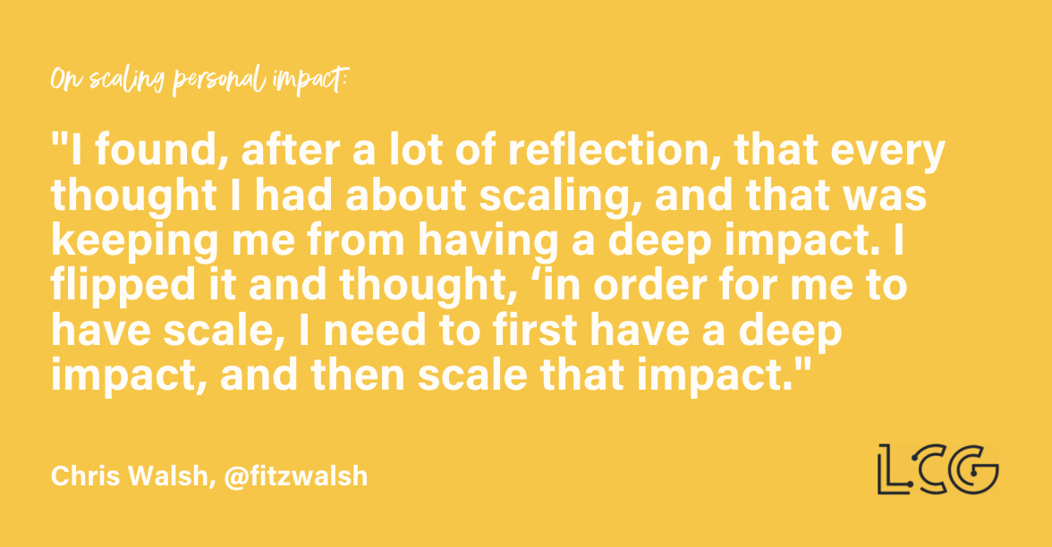 “I flipped it and thought, ‘in order for me to have scale, I need to first have a deep impact, and then scale that impact,’” Chris says. “That sounds so obvious now because that’s how almost every great company has ever been built, or every great product has been built. You have to go deep first and scale out of that depth.”