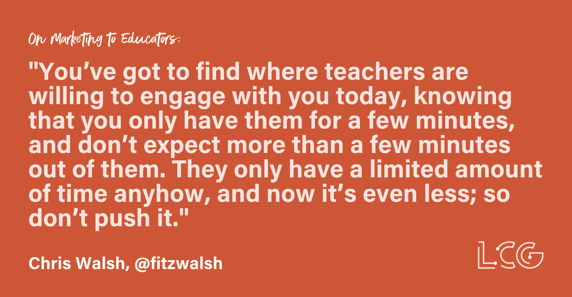 When marketing to teachers today, Chris reminds marketers to remember educator circumstances in every interaction — they’re stressed, burnt out, and have tons of other things competing for their very limited time. “You’ve got to find where teachers are willing to engage with you today, knowing that you only have them for a few minutes, and don’t expect more than a few minutes out of them. They only have a limited amount of time anyhow, and now it’s even less; so don’t push it.”