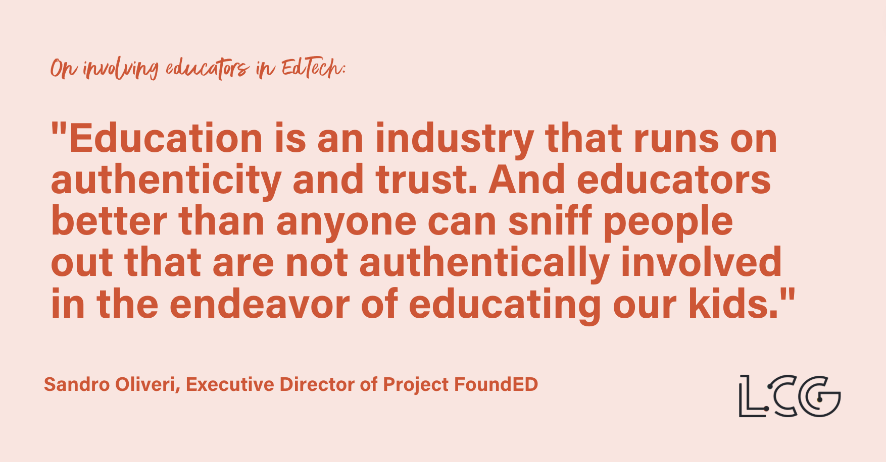 To help kick off the new year, we sit down with Sandro Olivieri, Executive Director of Project FoundED, a community of EdTech founders committed to empowering entrepreneurs and educators to rethink the EdTech landscape. During our chat, Sandro reinforces why EdTech is different from other business models, shares how the pandemic has been a mixed blessing for the industry, and reminds us all to keep educators in the driver's seat. If you like what you read, listen to the entire episode (embedded above or check out all of the links at the bottom of the page). To whet your appetite, we're sharing some of best nuggets of wisdom.