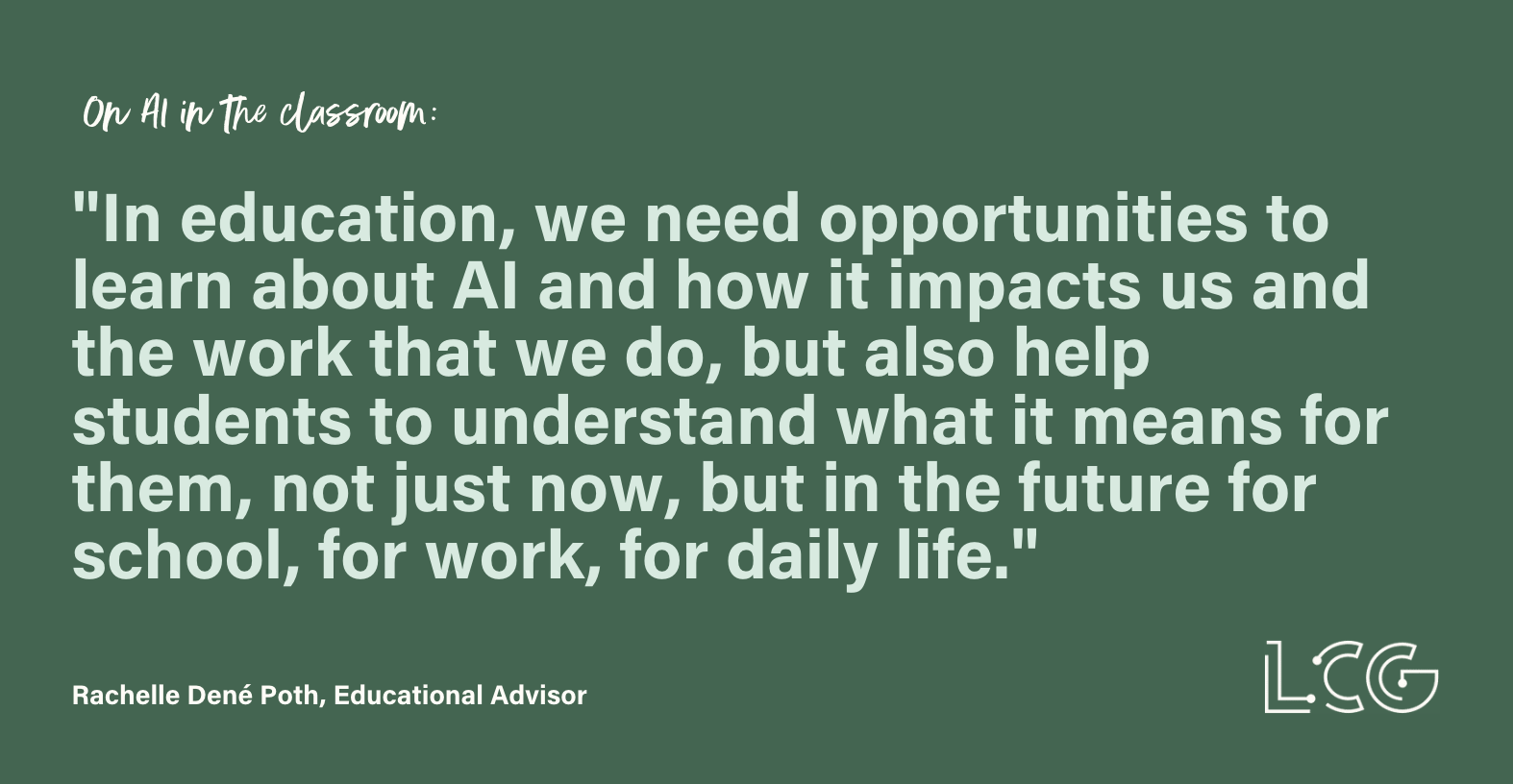 "Artificial intelligence becomes smarter over time; it can sort and process a lot of information. In our everyday lives, and even in education, there are tools that have AI built into them that enable teachers, and students as well, to do a lot of different things.EdTech and with any type of thing like artificial intelligence, we always have to look at the positives and negatives. In education, we need opportunities to learn about AI and how it impacts us and the work that we do, but also help students to understand what it means for them, not just now, but in the future for school, for work, for daily life."