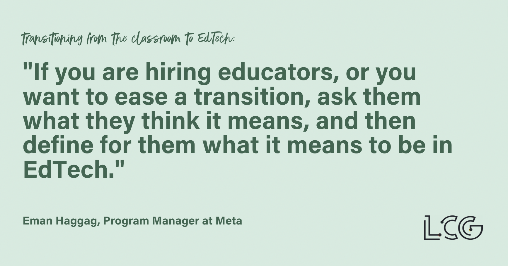 Eman Haggag, Program Manager at Meta, moved directly to the tech world by way of instructional coaching after 15 years of teaching and integrating K-12 STEM content. She sits down with Elana Leoni, CEO of Leoni Consulting Group, for an inspiring conversation about what it means for teachers to broaden their impact, how to reframe a strong skill set to be relevant for a different industry, and how EdTech companies can better use the perspectives of educators who want to join their ranks.