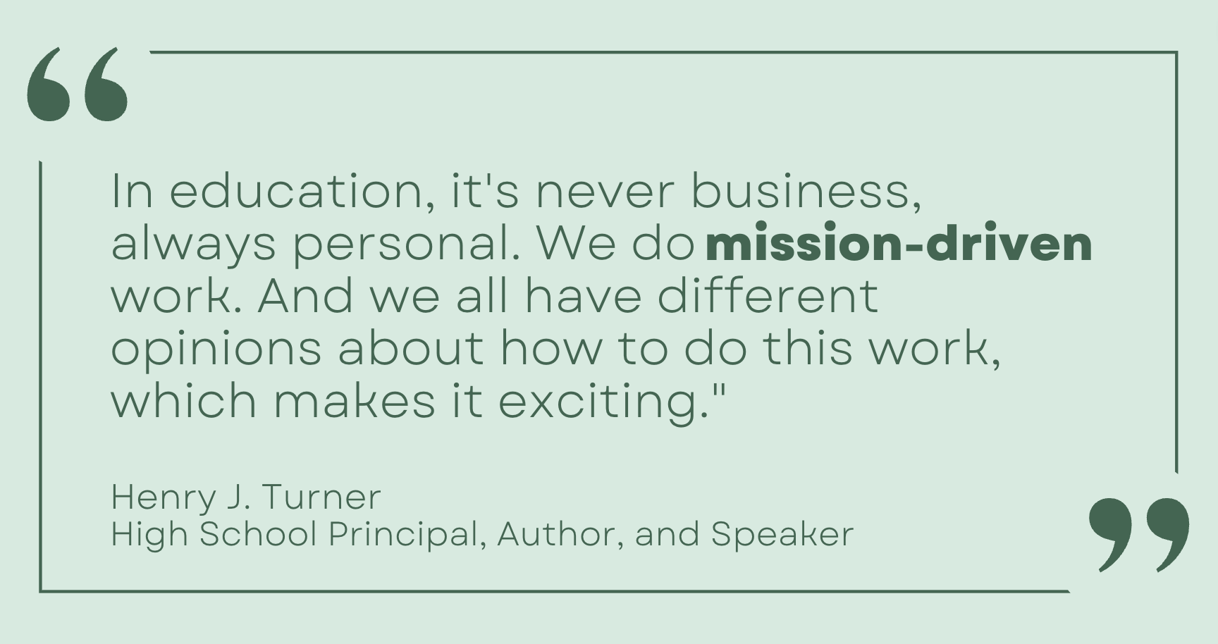 Henry J. Turner is an award-winning high school principal, author, and nationally renowned speaker. He is most proud of the collaborative community he works within to empower students to fight hate and bigotry in their school. Pointing to his unwavering commitment to equity and a student-centered culture, Henry was named 2020 K12 Principal of the Year by K–12 Dive.
